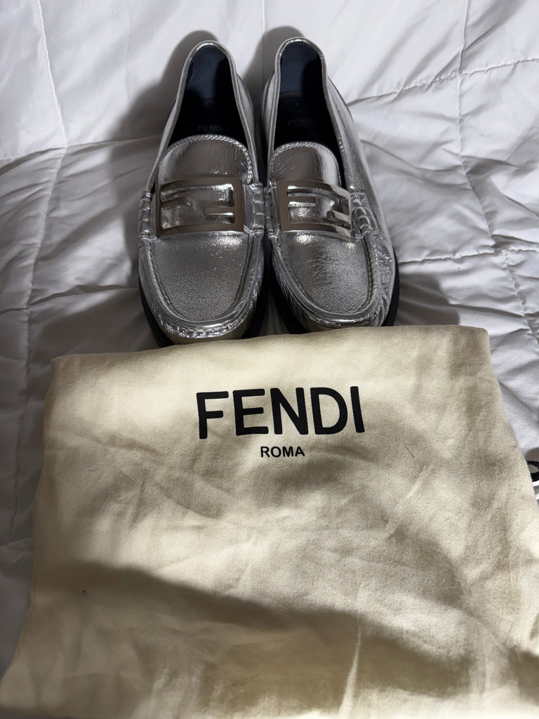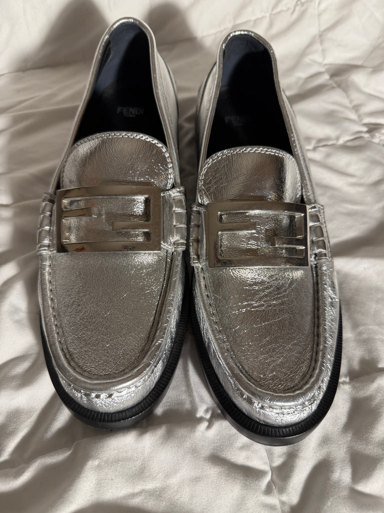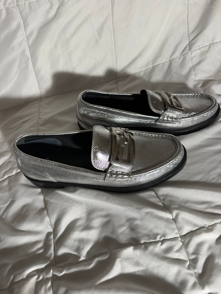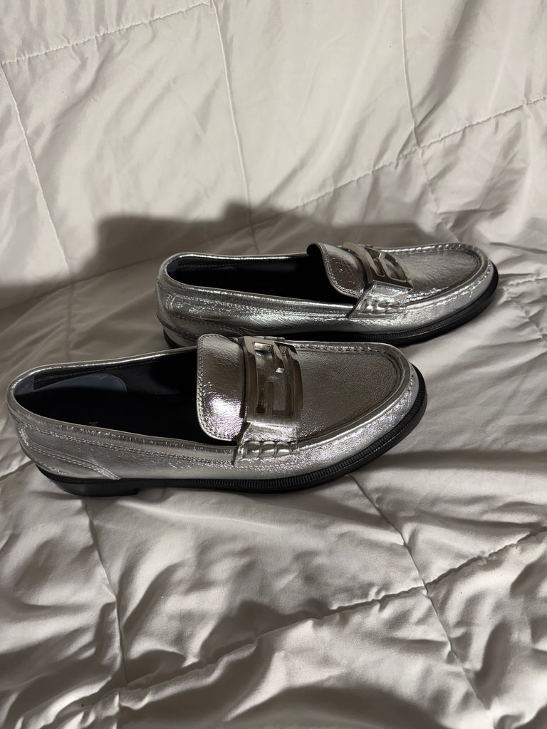 Fendi Baguette metallic silver leather loafers-Size 39.5 / 9